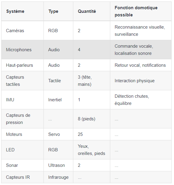 Question 1 : Complétez le tableau des capteurs et actionneurs de NAO